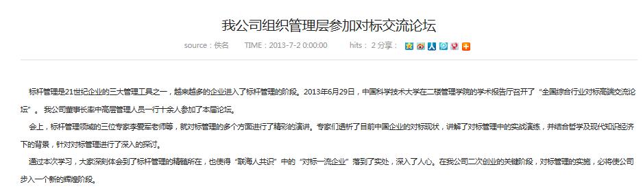 標桿管理是21世紀企業的三大管理工具之一,越來越多的企業進入了標桿管理的階段。2013年6月29日,中國科學技術大學在二樓管理學院的學術報告廳召開了“全國綜合行業對標高端交流論壇”。 我公司董事長....