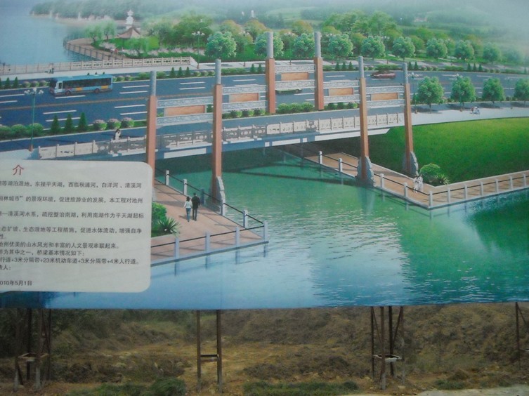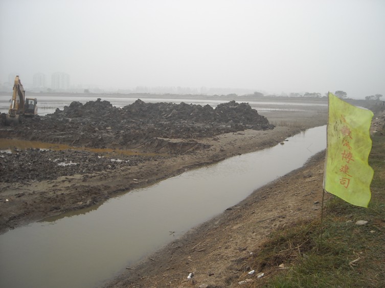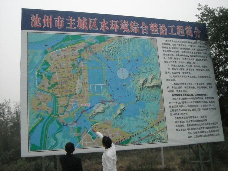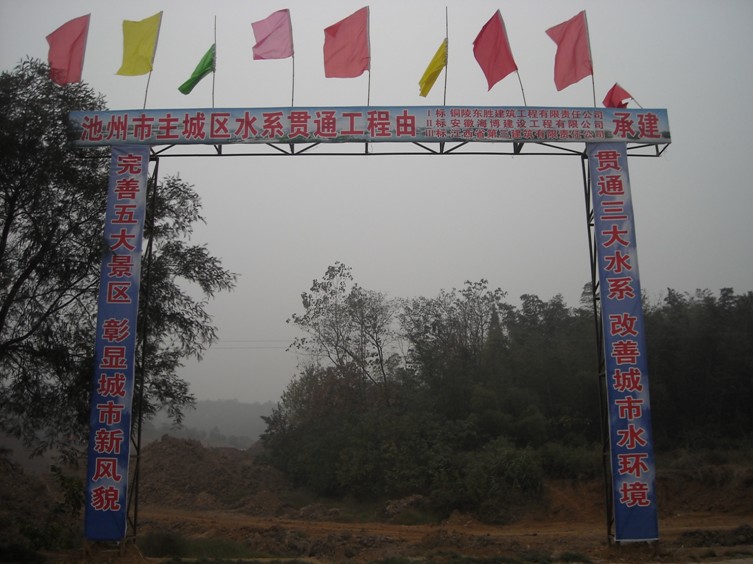 我公司承建的池州市重點市政工程——主城區(qū)水系貫通工程,已于10月18日正式開工。內容包括:疏浚河道4.54公里,(河道底寬20米,挖深3米)、生態(tài)護坡(三維土工網草皮護坡)、生態(tài)濕地、親水平臺(護砌高度達7.1~9.1米的硬護岸)、柳桉木的棧橋、棧道等。