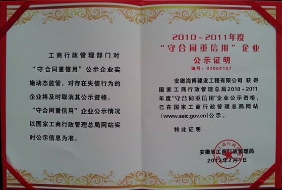 繼2007-2008年度、2009-2010年度連續兩屆“省級守合同重信用”榮譽后,在2010-2011年度“守合同重信用”申報評選中,我公司有幸獲得合肥市工商行政管理局和安徽省工商行政管理局的一致認可,推選申報“國家級守合同重信用”單位,并順利通過國家工商行政管理總局的審查,喜獲“國家級守合同重信用”殊榮。