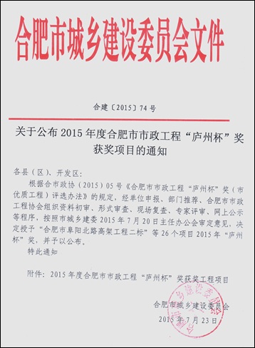 炎炎夏日,驕陽似火,我公司喜獲2015年度合肥市市政工程“廬州杯”獎,給酷熱的盛夏送來了陣陣涼意。由公司承建的合肥市高新區寧西路(長寧大道-肥西界)道橋及附屬工程經合肥市城鄉建設委員會及合肥市市政工程協會審定,順利獲得此次獎項。