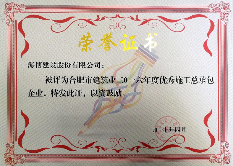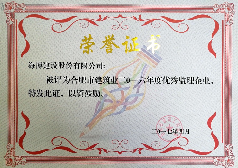 在一年一度的合肥市建筑業(yè)優(yōu)秀企業(yè)評(píng)選中,我單位經(jīng)過(guò)市建委、市建筑工程協(xié)會(huì)的層層評(píng)比,最終獲得合肥市建筑業(yè)2016年度“優(yōu)秀施工總承包企業(yè)”及“優(yōu)秀監(jiān)理企業(yè)”雙項(xiàng)榮譽(yù)。