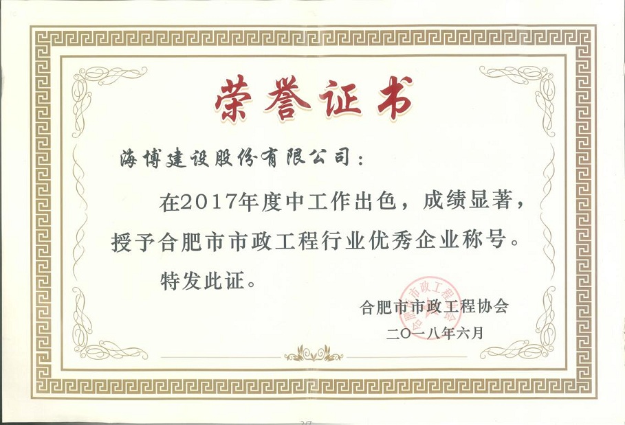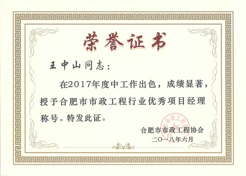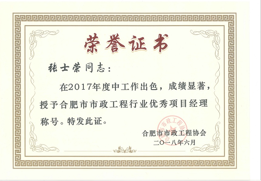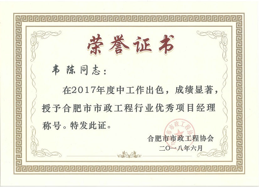 大會表彰了2017年度合肥市市政工程優(yōu)秀企業(yè)、優(yōu)秀項目經(jīng)理,本次大會共表彰優(yōu)秀企業(yè)83家,優(yōu)秀項目經(jīng)理159名,我司再次榮獲“合肥市市政工程優(yōu)秀企業(yè)稱號”,3名項目經(jīng)理獲得“優(yōu)秀項目經(jīng)理稱號”。大會同時表彰了2017年度合肥市市政養(yǎng)護示范設(shè)施“扁鵲杯”、合肥市市政工程建設(shè)優(yōu)秀QC小組活動成果等獲獎項目及單位。