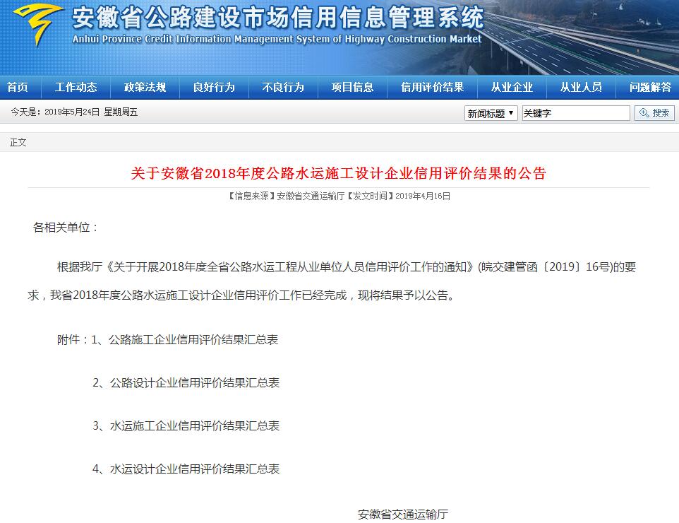 近日,安徽省交通運(yùn)輸廳公告了“安徽省2018年度公路水運(yùn)施工設(shè)計(jì)企業(yè)信用評(píng)價(jià)結(jié)果”,我公司被評(píng)為省級(jí)公路施工行業(yè)最高等級(jí)“AA”級(jí)信用企業(yè)。